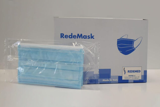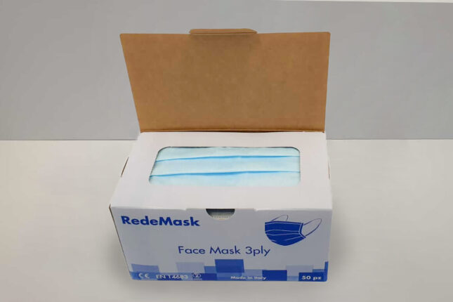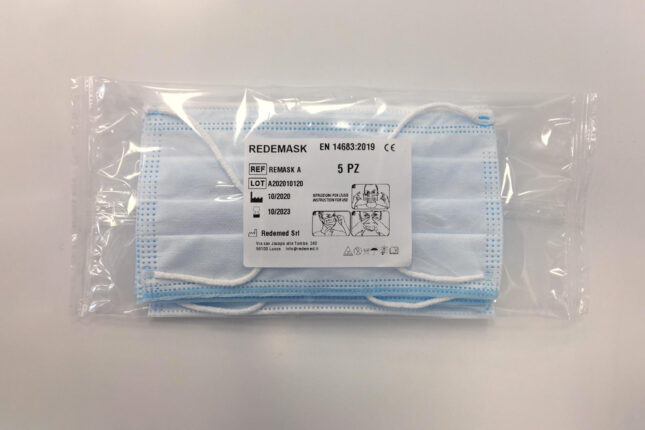 Mascherina chirurgica tre strati, con elastico e stringinaso, EN 14683 CE.